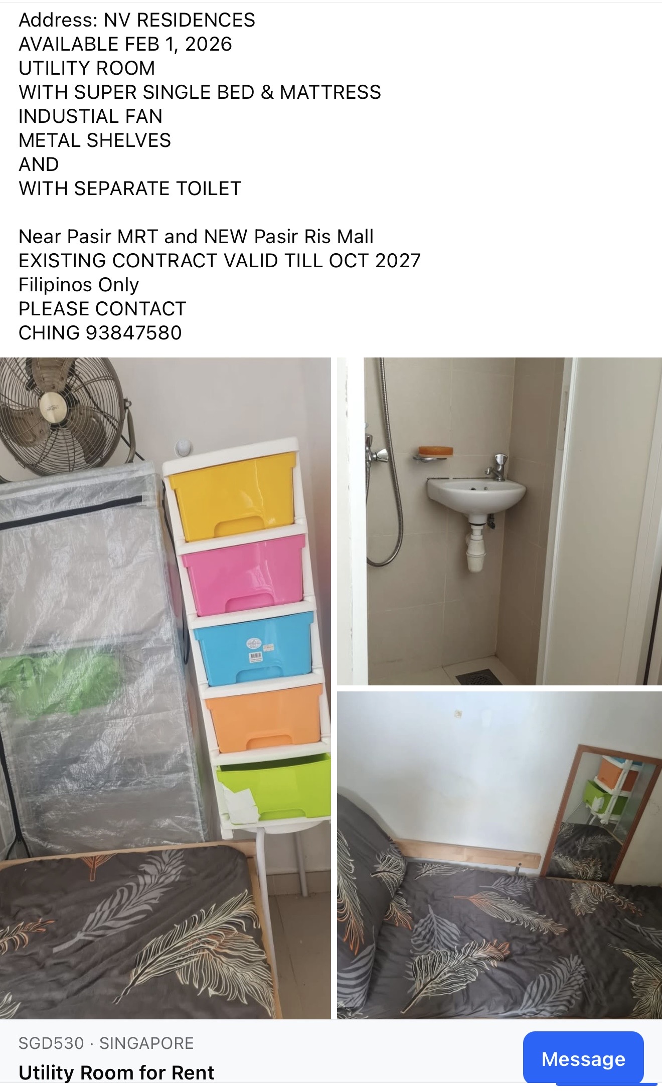 ✅utility room $700 ✅common rooms $480/pax ✅cooking/laundry allowed ✅near to whampoa market and makan place ✅available...
